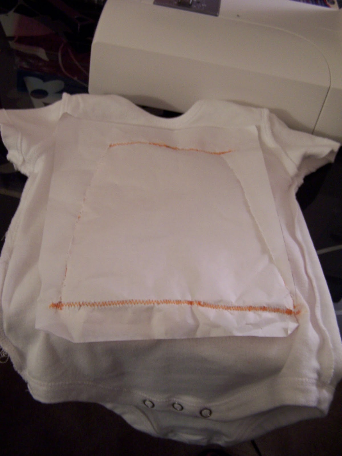 To stabilize the knit fabric of the body suit while we are sewing, we are going to use another piece of freezer paper. If you have another stabilizing material you would prefer to use, you can use that instead. Slide a piece of freezer paper inside the bodysuit so that it is shiny side up and lines up (with overlap) with the area you would like the mitt sewn to.