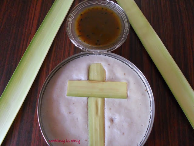 6. Pour into a well greased steaming tin or pan. Place the palm leaf in the shape of a cross.