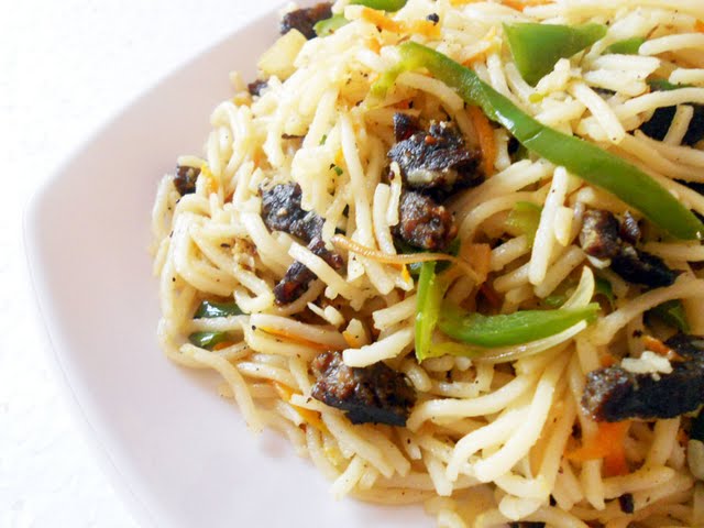 4. Meanwhile cook and drain noodles as instructed in the packet. Heat oil in a wok or large kadai. Add the slit garlic, then one by one add the veggies; onion, capsicum, and carrot. Add the sauces. You can decrease or increase them mildly according to your taste. Add salt and pepper powder. Stir fry own high flame.....toss in the beef