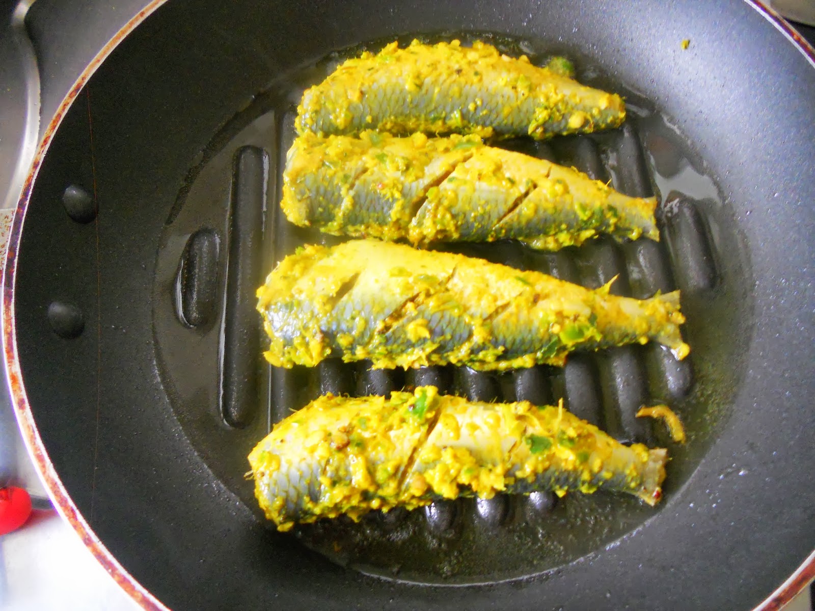 Grilled Fish, Kerala Style-sardine is marinated in spicy green chilli masala for a change from the every day fish fry which I make for lunch. Green chilli, curry leaves, ginger, garlic etc is grinded and rubbed into the fish and grilled on low flame, is a special low fat treat for fish lovers.